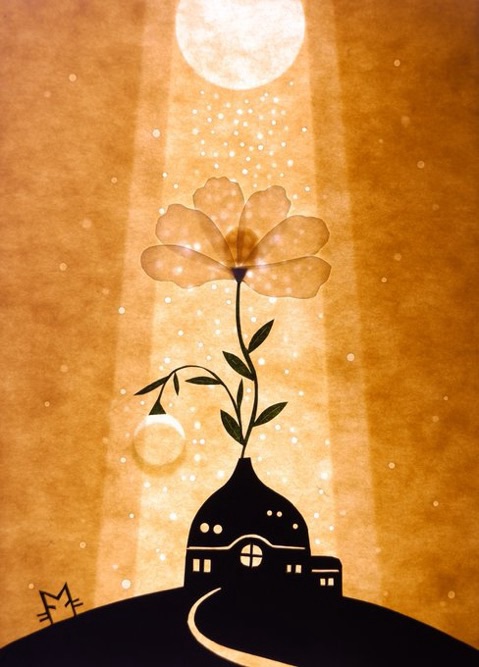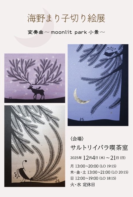 かぼちゃクリーム入り黒ごまロールケーキは、現在開催中(〜12/21まで)の海野まり子(@mariko_mattyt )個展「変奏曲〜moonlit park 小景〜」に合わせてご用意しました。海野さんの作品の月明かりと、それに映し出される影とのコントラストの美しさに感銘を受けて、当店では個展期間中限定のおやつとしてご提供いたします。クリームにはかぼちゃの他に自家製の練乳も加えています。風味と素材の持つ自然な色味を重視したため、海野さんの作品のようなパッキリとメリハリのあるコントラストではなく、くすんだパステル調で靄のかかった月夜のようではありますが、作品を観ながら黒ごまとかぼちゃの優しい風味を楽しんでいただければ嬉しいです。お茶とのセットもございます。今週までのご提供となります。