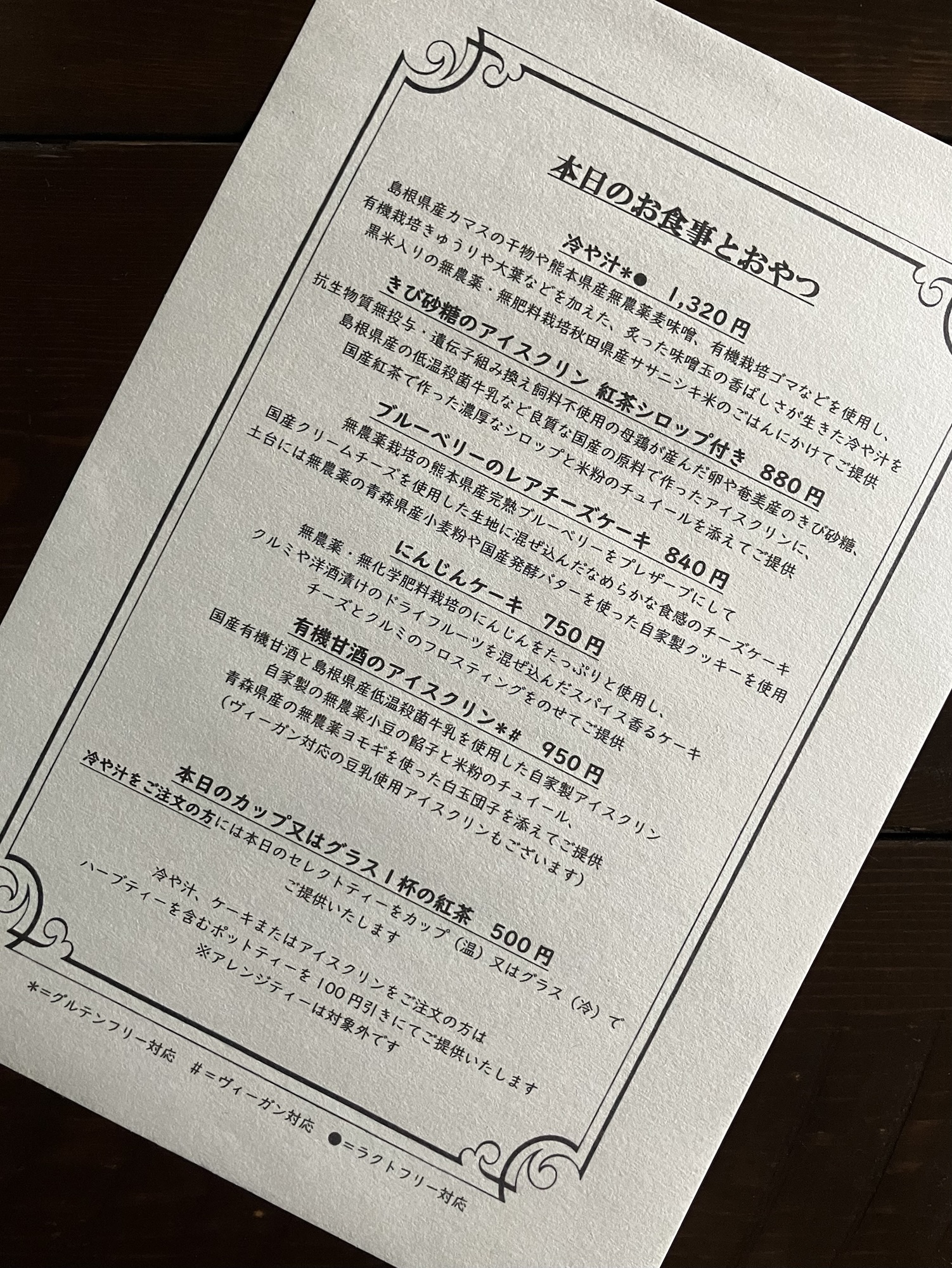 ※冷や汁はグルテンフリー及びラクトフリー対応、きび砂糖のアイスクリンはグルテンフリー対応、有機甘酒のアイスクリンは牛乳を使用したグルテンフリー対応か、豆乳を使用したヴィーガン及びグルテンフリー対応か、お選びいただけます。