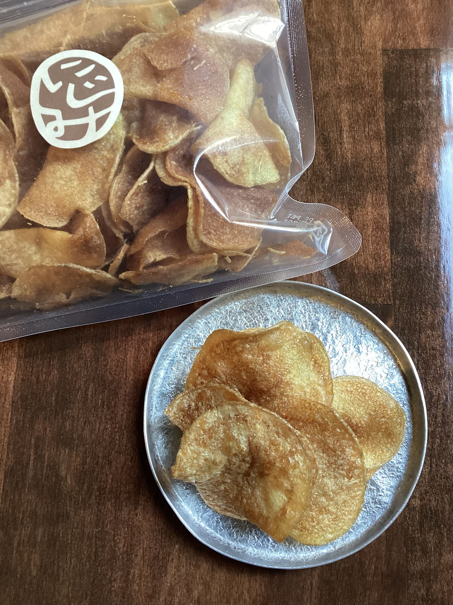 今回初入荷のポテトチップスは、長崎県で作出された「あいまさり」という品種のじゃがいもで作られています。滑らかな触感で食味の良い品種だそうです。品種の特性で揚げ色は濃いめ、しっかりとした味わいですが食感はとても軽やかで、にじみさんらしい塩の塩梅も優しく絶妙、満足感がありますが重たくありません。さつま芋を使った芋けんぴ同様に、袋を開けると手が止まらなくなりそうなハマる味わいです。