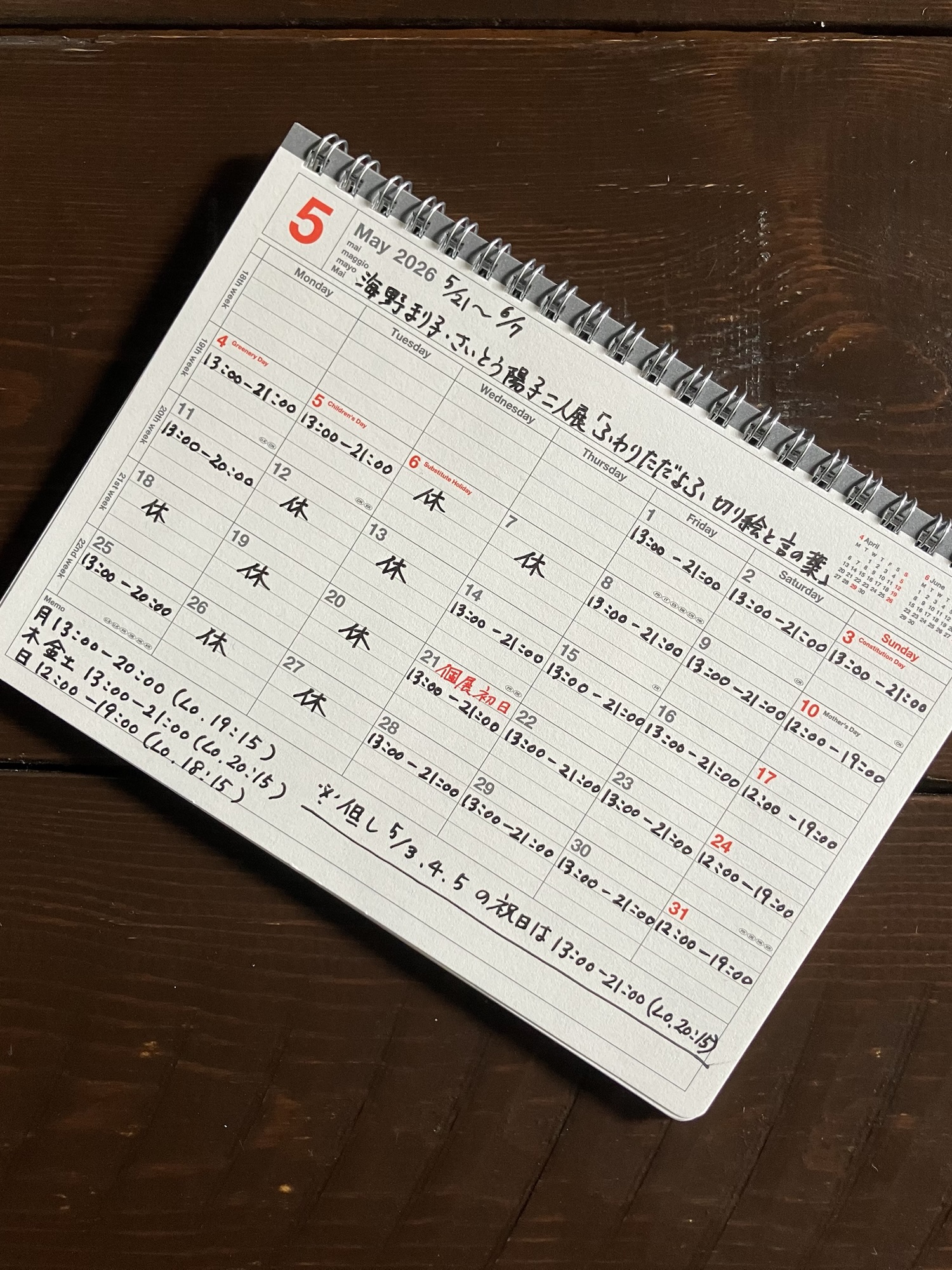 今月は連休の兼ね合いから営業日時が変則的です。また、5月21日(木)〜 海野まり子・さいとう陽子二人展「ふわりただよふ 切り絵と言の葉」を開催いたします。